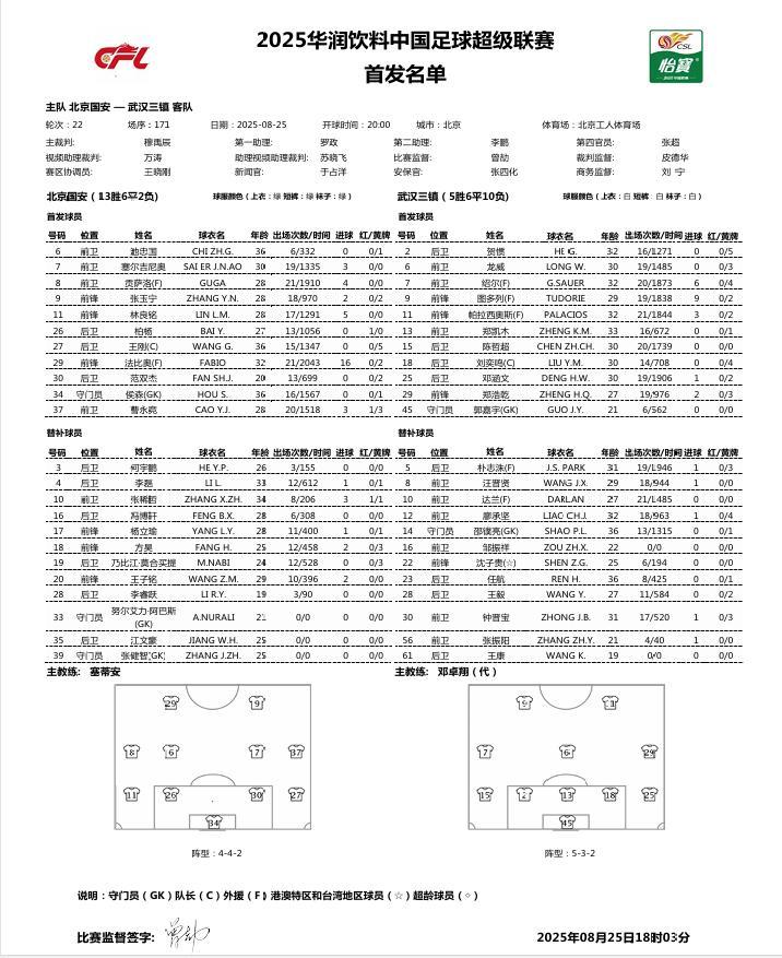 25日晚8点,北京国安将在中超第22轮比赛中主场迎战武汉三镇队,赛前一小时,国安公布首发名单,塞蒂恩重新采用三中卫体系,老将池忠国获得先发机会,而上轮替补登场后表现不错的曹永竞同样首发出场。值得一提的是,此役国安在首发名单中依然只派出了古加和法比奥两人,达万和恩加德乌依然无缘登场,二人均未出现在大名单中。